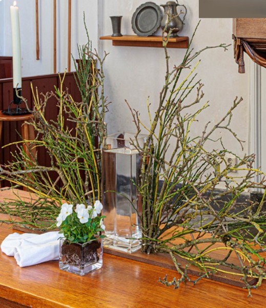 Onze werkgroep Symbolisch bloemschikken zorgt tijdens de 40-dagentijd voor een toepasselijk bloemstuk.