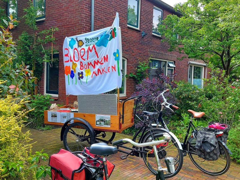 De vrijwilligers van De Groene Verbinding rijden en staan met een bakfiets in het centrum van het dorp om het winkelend publiek aan te moedigen meer groen te denken en te doen.